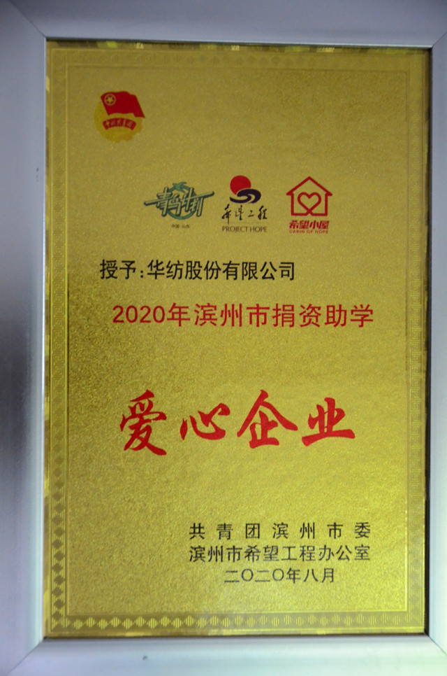 活動現(xiàn)場,公司被授予2020年濱州市捐資助學(xué)愛心企業(yè)。公司團(tuán)委積極響應(yīng)團(tuán)市委的倡議,組織開展了“希望小屋”愛心募捐活動,各部室、各車間組織愛心募捐,各工會干部、團(tuán)支部書記踴躍帶頭,全公司廣大干部職工參與廣泛,充分體現(xiàn)出華紡人擔(dān)當(dāng)?shù)纳鐣?zé)任精神。