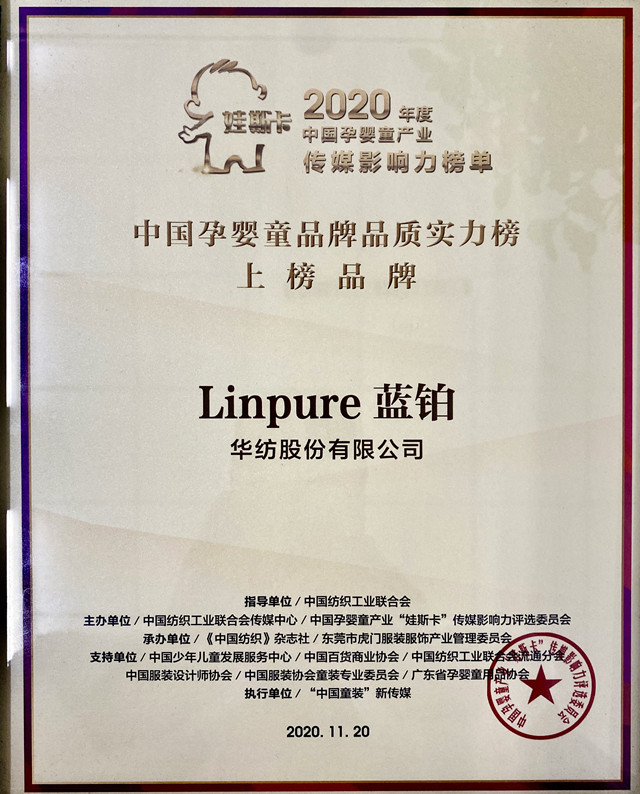 導(dǎo)讀:日前,公司Linpure藍(lán)鉑品牌既獲“娃斯卡”2019年度中國孕嬰童品牌暖心實力榜后,再獲中國孕嬰童產(chǎn)業(yè)“娃斯卡”傳媒影響力評選委員會頒發(fā)的2020年度中國孕嬰童品牌品質(zhì)實力大獎。