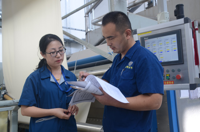 圖為巡查人員盧敏捷(左)在與家紡車間340水洗機(jī)擋車工李正(右)落實(shí)、核對該機(jī)臺的維修及運(yùn)行數(shù)據(jù)。