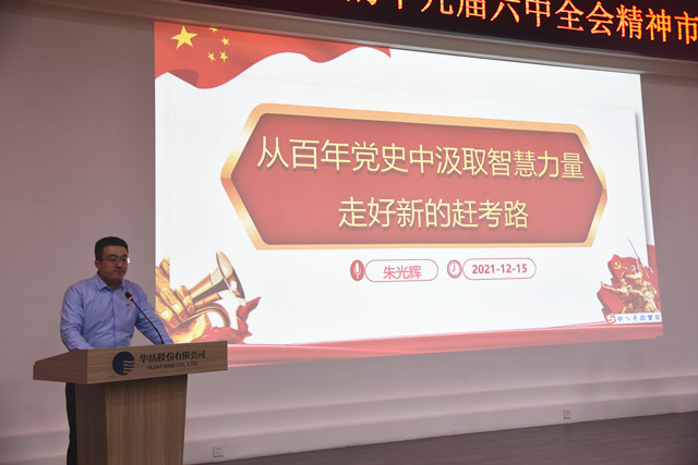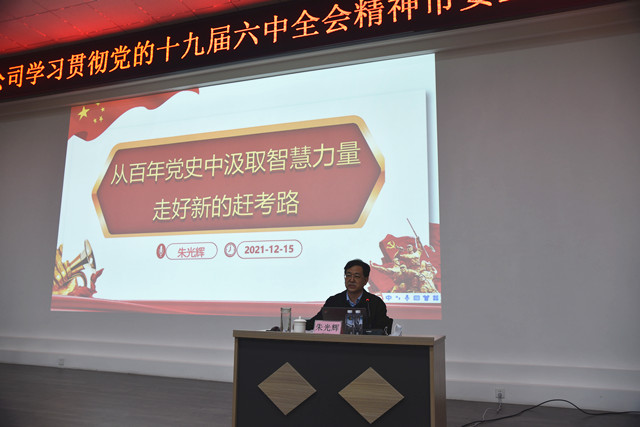 12月18日,市委宣講團成員、市政協(xié)臺港澳僑和外事委員會副主任朱光輝來到公司,對黨的十九屆六中全會精神進行專題宣講。宣講會由公司團委書記陳冰主持,公司黨委成員、行政班子成員、黨支部書記、黨員代表、預備黨員以及來自公司各個序列的中高層管理者,共120余人在聆聽了當天的宣講。