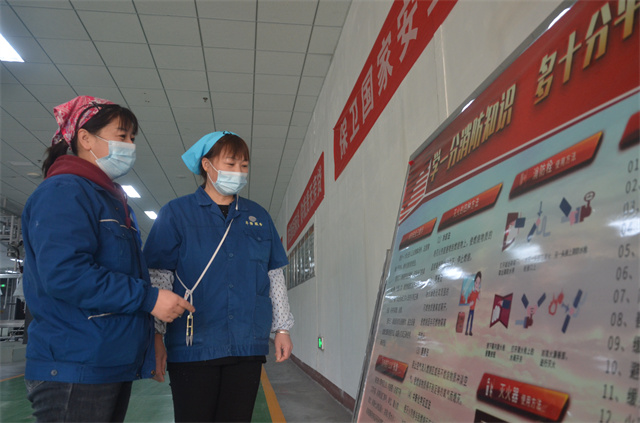 圖為公司家紡成品車間單針班兩名員工,在消防宣傳內(nèi)容前交流的情形。