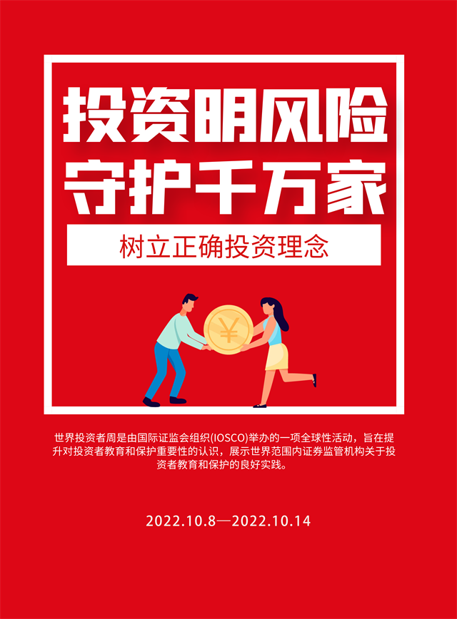 2022年“世界投資者周”將圍繞“投資明風(fēng)險(xiǎn),守護(hù)千萬(wàn)家”主題,向投資者普及《期貨和衍生品法》、普及綠色金融、綠色投資理念,引導(dǎo)投資者閱讀上市公司定期報(bào)告、踐行以信息披露為核心的注冊(cè)制理念,向投資者傳播金融證券知識(shí),提示投資風(fēng)險(xiǎn),增強(qiáng)理性投資、價(jià)值投資、長(zhǎng)期投資、風(fēng)險(xiǎn)防范意識(shí),引導(dǎo)投資者樹立正確投資理念。