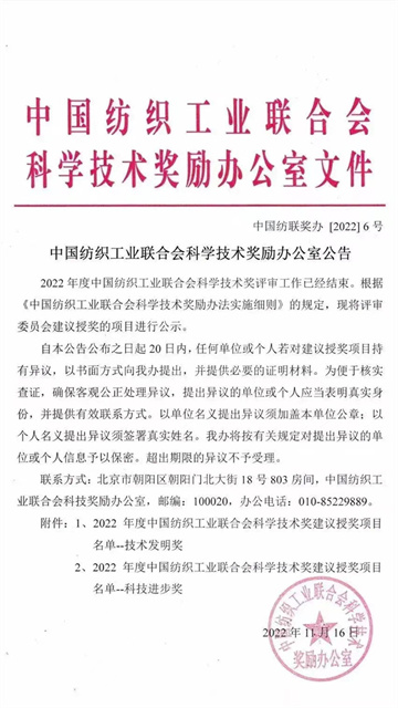 導(dǎo)讀:中國紡織工業(yè)聯(lián)合會向社會公示了“2022年度科學(xué)技術(shù)獎授獎項目名單”,公司“全流程印染過程數(shù)字化控制技術(shù)研究與應(yīng)用示范”成果,獲得全國紡織行業(yè)2022年度技術(shù)進(jìn)步獎二等獎。