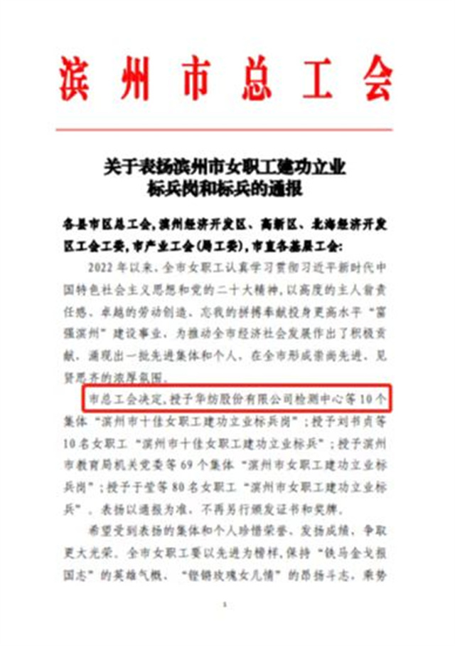 導(dǎo)讀:日前,公司檢測中心榮獲“濱州市十佳女職工建功立業(yè)標(biāo)兵崗”榮譽(yù)稱號(hào)。