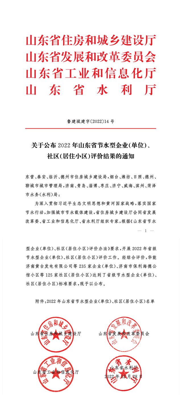 近日,山東省住房和城鄉(xiāng)建設(shè)廳會同山東省發(fā)展和改革委員會、山東省工業(yè)和信息化廳、山東省水利廳發(fā)布了《關(guān)于公布2022年山東省節(jié)水型企業(yè)(單位)、社區(qū)(居住小區(qū))評價(jià)結(jié)果的通知。經(jīng)綜合評價(jià),公司達(dá)到了省級節(jié)水型企業(yè)的標(biāo)準(zhǔn)要求,獲評山東省節(jié)水型企業(yè)。