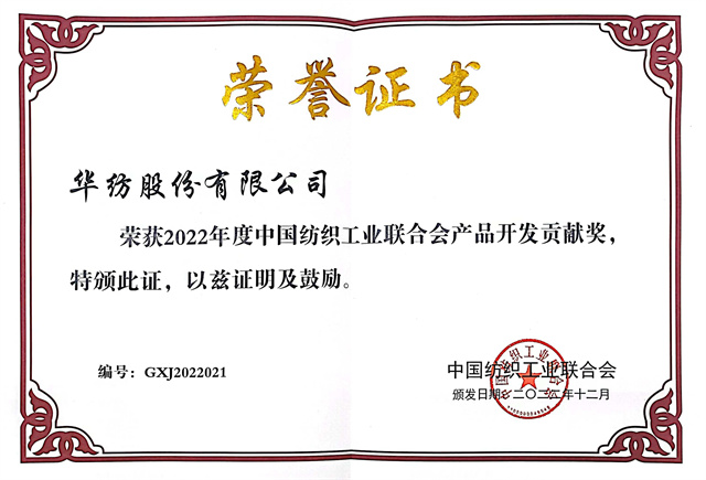 公司獲評中國紡織工業(yè)聯(lián)合會產(chǎn)品開發(fā)貢獻(xiàn)獎