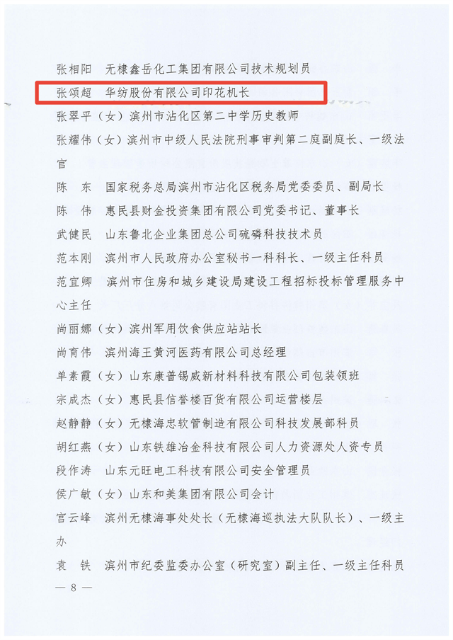 近日,濱州市總工會(huì)發(fā)布了“關(guān)于2023年濱州市五一勞動(dòng)獎(jiǎng)和濱州市工人先鋒號(hào)的通報(bào)”,對(duì)獲得濱州市五一勞動(dòng)獎(jiǎng)狀的無(wú)棣鑫岳燃化有限公司等26個(gè)單位,獲得濱州市五一勞動(dòng)獎(jiǎng)?wù)碌亩?90名個(gè)人,獲得濱州市工人先鋒號(hào)的濱州中裕食品有限公司面條三車(chē)間等30個(gè)集體予以通報(bào)表?yè)P(yáng)。其中,公司花布車(chē)間印花機(jī)機(jī)長(zhǎng)張頌超榮獲2023年濱州市五一勞動(dòng)獎(jiǎng)?wù)隆?br />