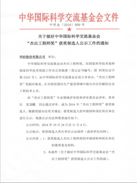 經“杰出工程師獎”專業(yè)領域評審組和評審委員會評審,華紡股份有限公司王力民同志通過評審,成為2016年“杰出工程師獎”獲獎候選人。根據(jù)獎勵辦法有關規(guī)定,獲獎候選人的申報材料需所在單位進行公示。公示如下: