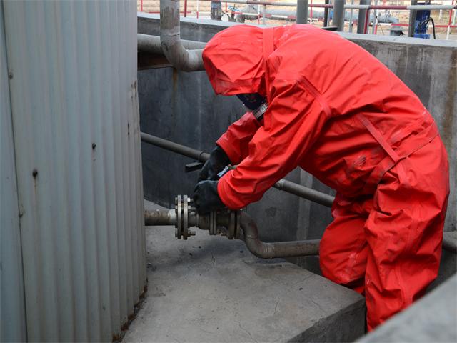 兩名穿戴防護(hù)裝備的人員關(guān)閉了相關(guān)的氨水罐、氨水泵閥門(mén),并安排人員迅速設(shè)立警戒線(xiàn),禁止無(wú)關(guān)的人員及車(chē)輛進(jìn)入。查看氨水罐圍堰是否有泄漏點(diǎn),用鐵锨鏟土進(jìn)行進(jìn)行封堵,防止污染物排出,造成環(huán)境污染。同時(shí)對(duì)已進(jìn)入排水溝的氨水用大量的稀釋水進(jìn)行稀釋?zhuān)刮廴疚镞_(dá)到外排條件,各閥門(mén)關(guān)閉后泄露得到控制。整個(gè)過(guò)程緊張有序。