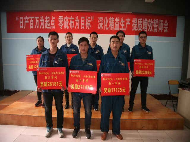 3月3日,公司召開主題為“日產(chǎn)百萬為起點(diǎn)、零疵布為目標(biāo)”深化精益生產(chǎn)、提質(zhì)增效誓師大會(huì),公司高管、分公司經(jīng)理、業(yè)務(wù)經(jīng)理、車間主任、職能部室主任、輪班長、技術(shù)員和機(jī)組長代表近200人參加會(huì)議。會(huì)上,公司黨委書記、董事長王力民為今年1-2月份各車間“單機(jī)計(jì)劃完成率”、“一次通過率”競(jìng)賽優(yōu)秀機(jī)臺(tái)代表頒發(fā)獎(jiǎng)勵(lì)牌,并圍繞進(jìn)一步強(qiáng)化精益生產(chǎn)做重要講話;總經(jīng)理閆英山對(duì)精益生產(chǎn)執(zhí)行情況,特別是今年1-2月份情況進(jìn)行了深入分析總結(jié),提出了新的任務(wù)與目標(biāo)。