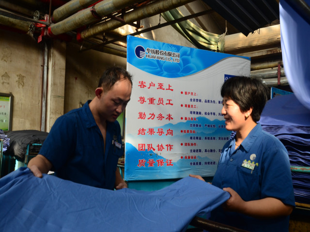 圖為面二車間甲班4#水洗機機長劉學濤(左)在與出檢工張海燕查看下機產(chǎn)品的質(zhì)量情況。